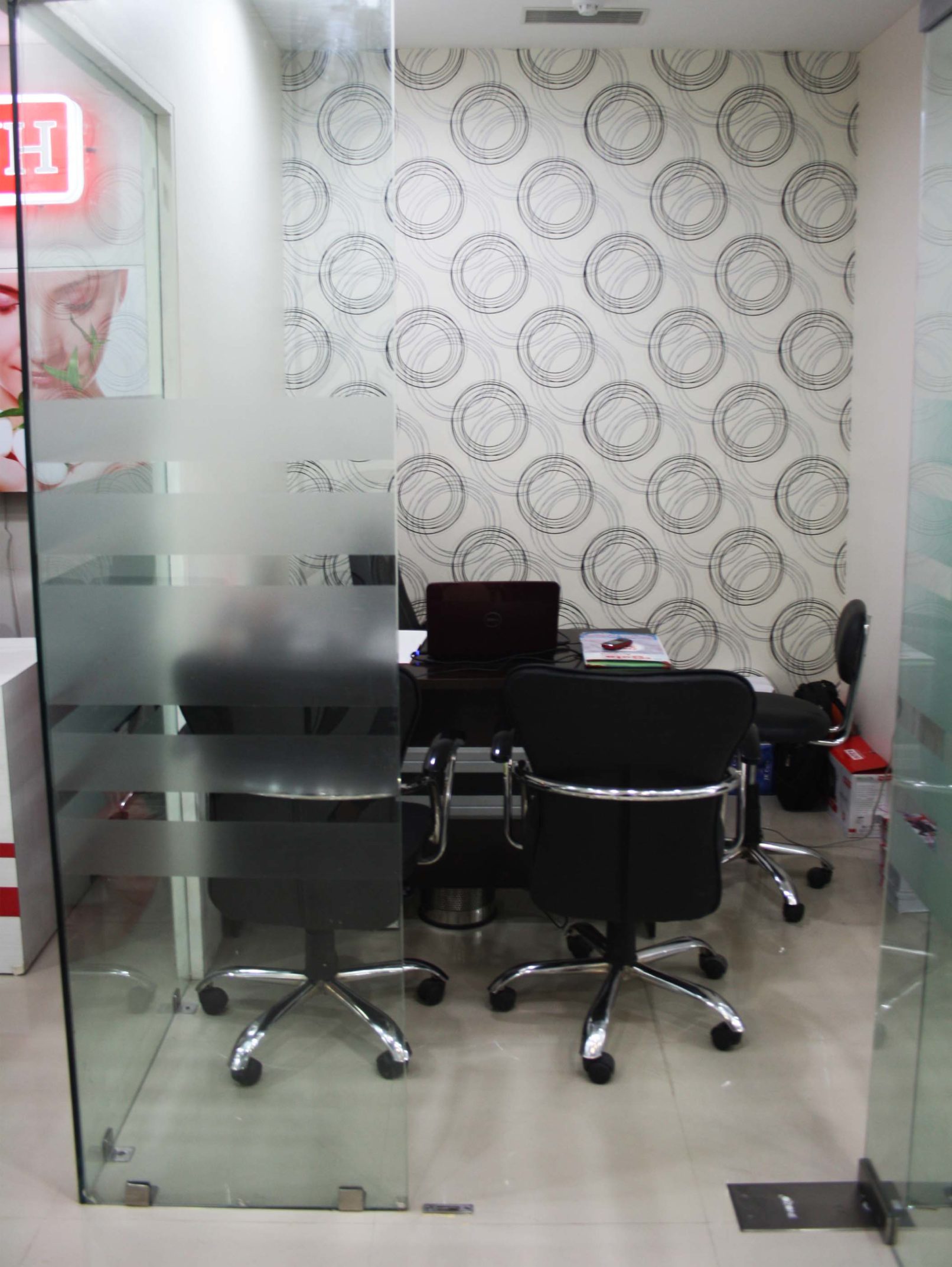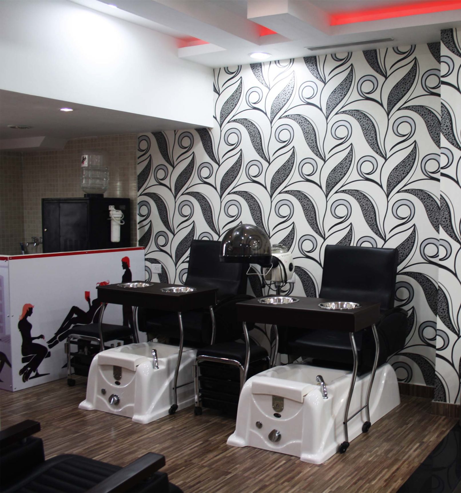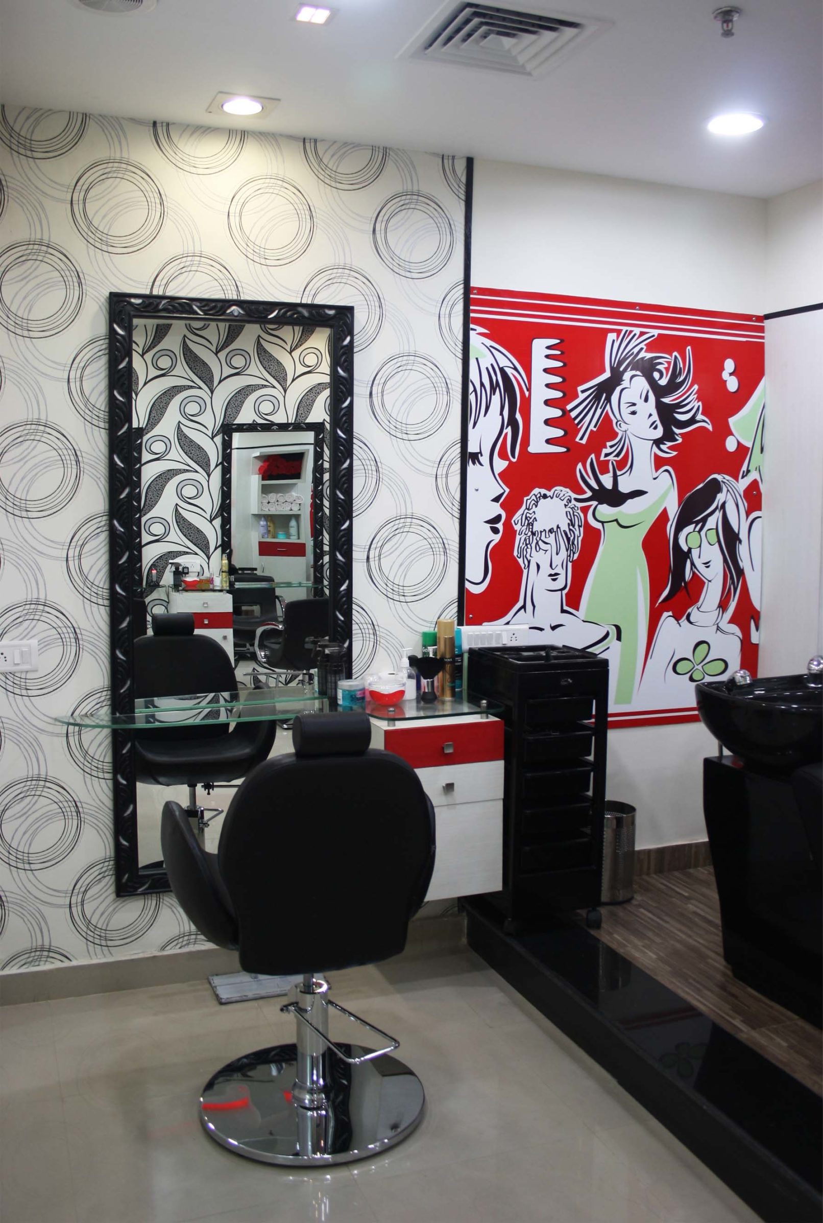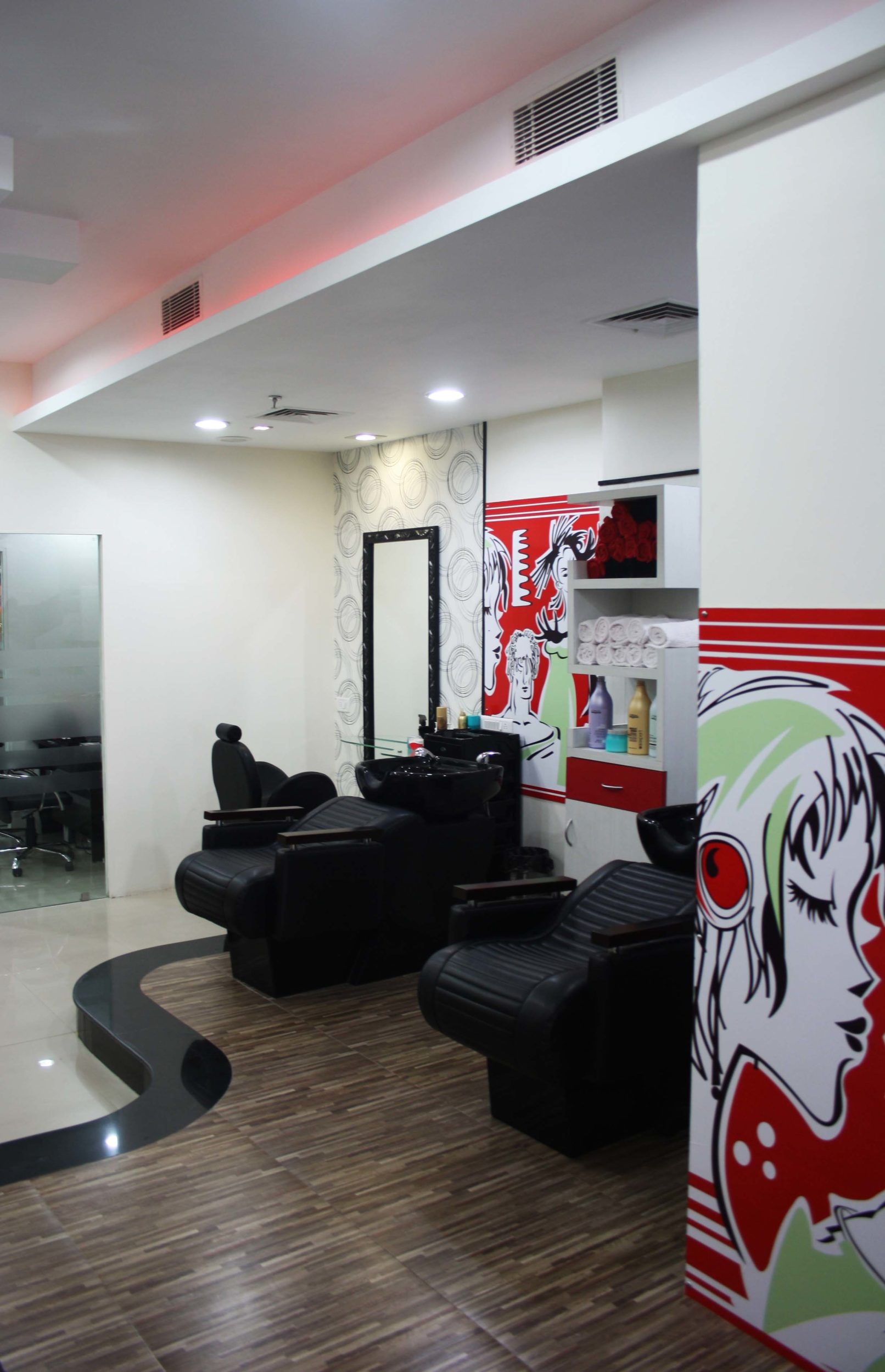 Situated at the Rajiv Gandhi Chandigarh Technology Park is one of Jawed Habib’s salon franchise. Five cutting stations, two shampoo stations, two pedicure stations, two beauty rooms, a colour mixing lab and kitchen corner were all planned within the 1200 Sft. showroom space. Here, we adhered to the franchise norms thus red, black and white colours were used along with the signatory Jawed Habib graphics. Within these constraints, a creative and fresh look was given to the space.